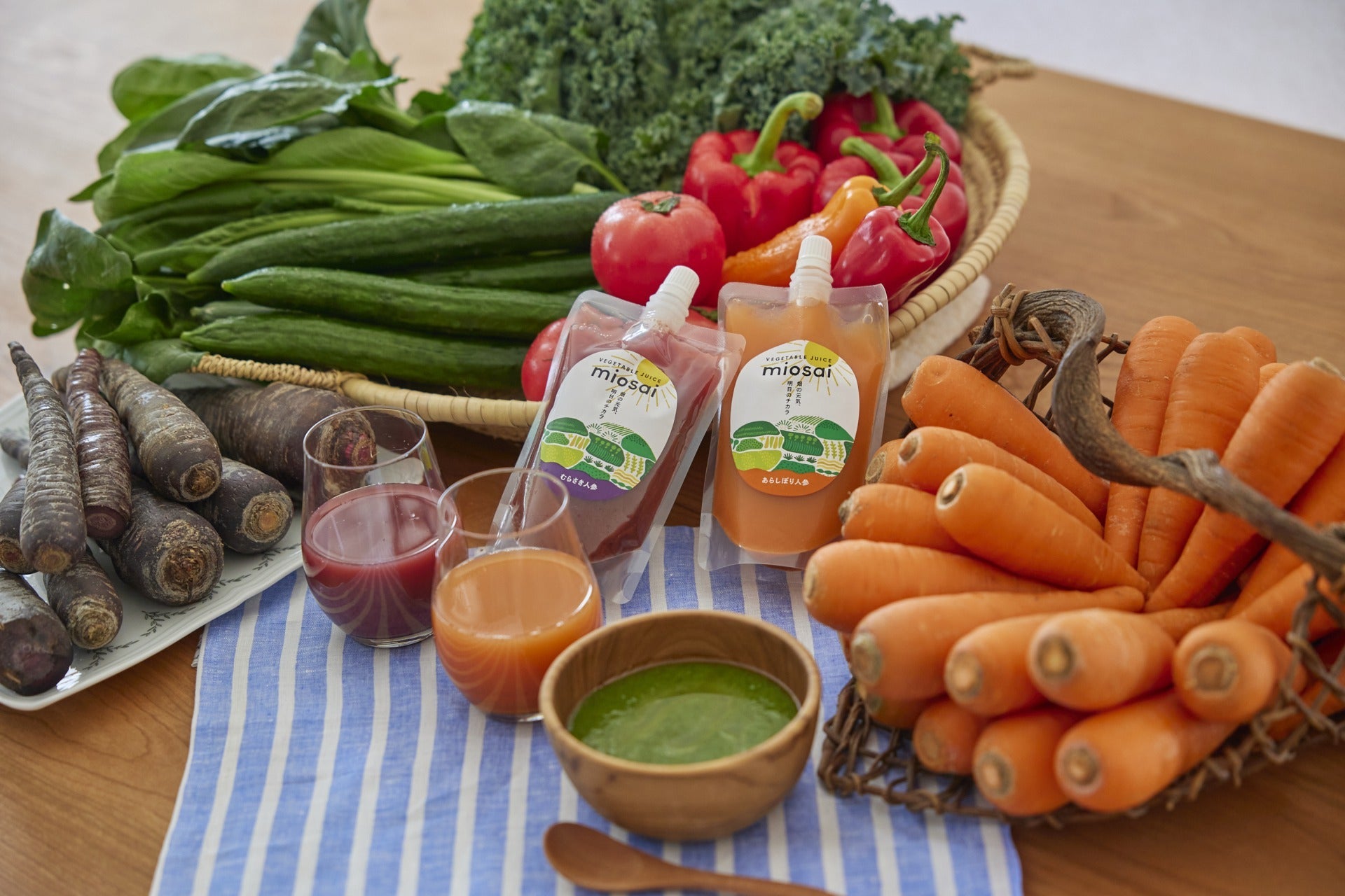 ミオサイのジュース5種類(あらしぼり人参、むらさき人参、なめらか人参、ビーツとトマト、トマトと菊いも)と野菜ピュレ4種類(トマトとパプリカ、いろいろグリーン、濃いめの緑黄色野菜、ケールとパイナップル)の大パックサイズ(900g)から、毎月、お好きな5種類をお選び頂けるお得な定期購入です。
